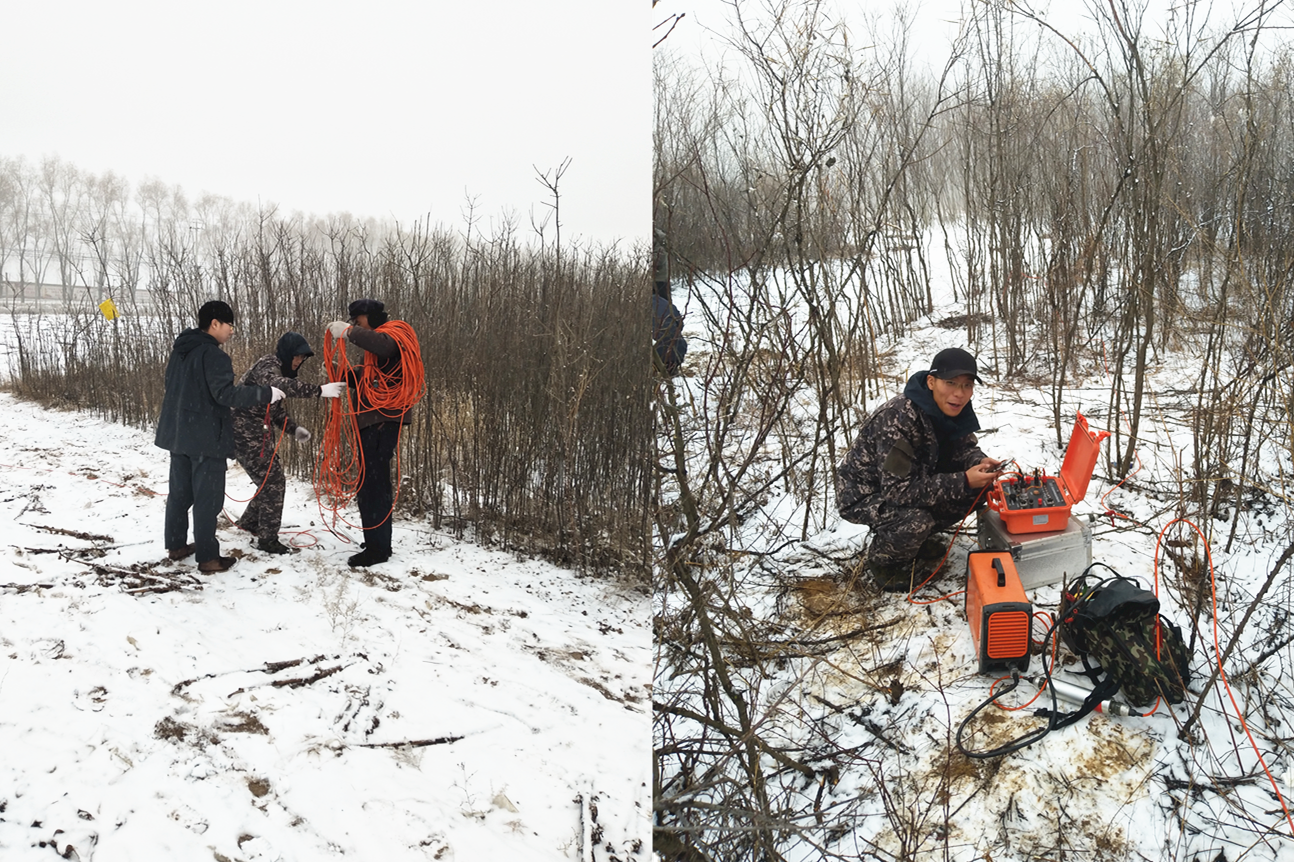 ? ? 為查明地下水分布情況,環(huán)境工程公司在隧道設(shè)計段地表開展高密度電法探測,查明隧道設(shè)計段100m以淺地下含水分布情況。項目組人員2020年1月3日抵達工區(qū)后,隨即開展野外勘察工作。時間緊、任務(wù)重,為盡快獲取探測數(shù)據(jù),在確保安全前提下,項目組克服了降雪、嚴(yán)寒天氣條件等不利因素,提高效率、縮短工期,高質(zhì)量完成了工作任務(wù),獲取了優(yōu)質(zhì)的探測數(shù)據(jù),項目實施效率和初步成果獲得了甲方高度評價。