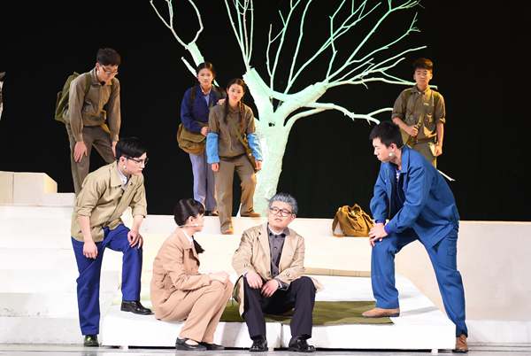 ? ? 場景中的小喇叭廣播再一次開始播報新聞,新聞的播報讓正拿著一堆科研手稿準備給自己老師的雅坤瞬間撲倒在地。是的也讓我們的心跟著揪起來,就算我們已經(jīng)知道這位偉大的地質力學之父、共和國第一位地質部長、中國科學協(xié)會第一任主席、這面旗幟—李四光先生已經(jīng)離世,但是我們還是為這小喇叭播報李四光先生的隕逝而悲痛。雅坤逐漸在兄弟廣生的悲劇和老師去世的陰影中走了出來,踏著老師的足跡帶著兄弟的夢想依然在科研工作中奮戰(zhàn),繼續(xù)發(fā)展老師的研究成果。到此話劇《大地之光》已經(jīng)結束,可李四光先生精神魅力猶如他的名字一樣光照四方!