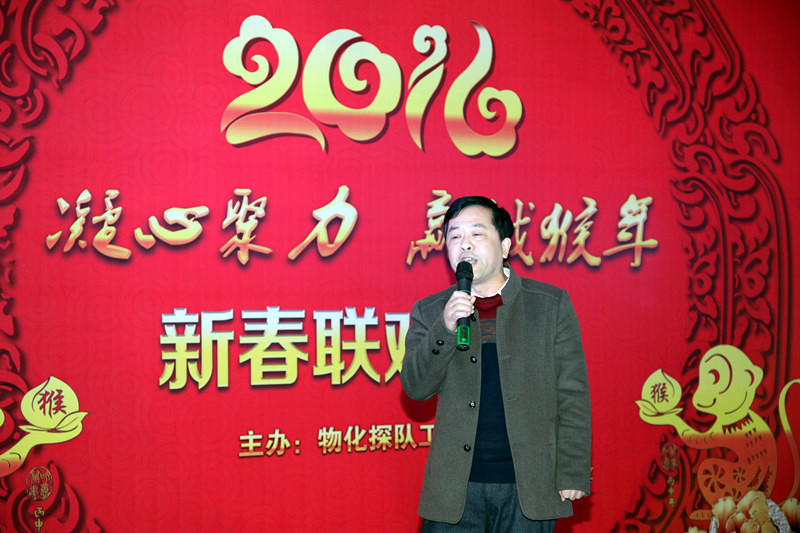 ??? 隊(duì)長王新坪致新春賀詞,他說:2015年在總公司的正確領(lǐng)導(dǎo)下,物化探隊(duì)創(chuàng)新發(fā)展,各項(xiàng)工作取得了顯著的成績。2016年按照總公司的新要求和物化探隊(duì)“大地質(zhì) 大物探 大發(fā)展”的經(jīng)營思路,凝心聚力,攻堅(jiān)克難, 贏戰(zhàn)2106。全體干部職工一定要奮力搏擊,敢于擔(dān)當(dāng),攜手同心,用智慧和汗水共譜物化探隊(duì)新篇章!王新坪代表物化探隊(duì)領(lǐng)導(dǎo)班子,祝全隊(duì)職工在猴年來臨之際,身體健康,闔家幸福,生活美滿,事業(yè)有成。